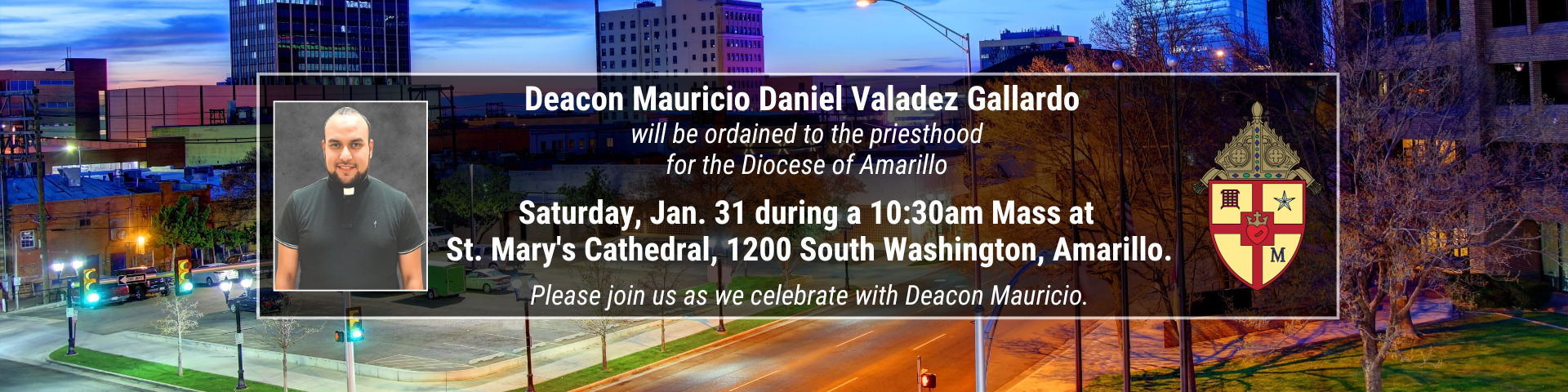 Deacon Mauricio Valadez, a seminarian for the Diocese of Amarillo, will be ordained to the Priesthood by Bishop Patrick J. Zurek during a 10:30am Mass Saturday, Jan. 31 at St. Mary’s Cathedral, 1200 South Washington.